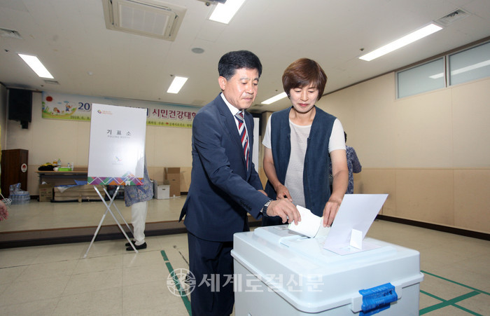 [세계로컬신문 조주연 기자] 정성주(민주평화당) 김제시장 후보 내외가 13일 오전 전북 김제시 요촌동 제3투표소에 들러 투표했다.