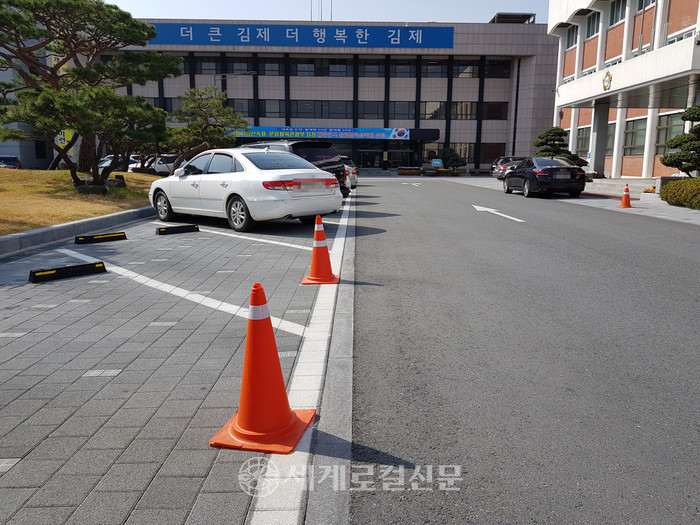 [세계로컬신문 조주연 기자] 2일 오전, 전북 김제시 의회 앞 주차공간에 라바콘이 세워져 있다. 시민들의 주차를 막고 시의원들의 주차공간을 확보하기 위해서다.