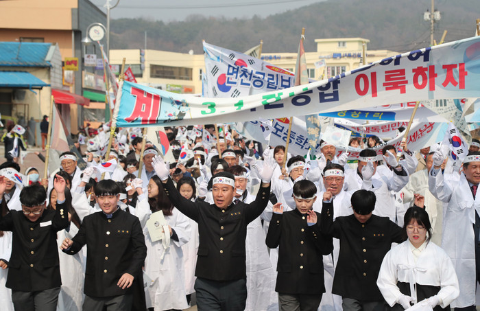 | ▲ 12일 충남 당진시 옛 면천초등학교 일원에서 참가자들이 '면천보통학교 3.10만세' 운동을 재현하고 있다. |