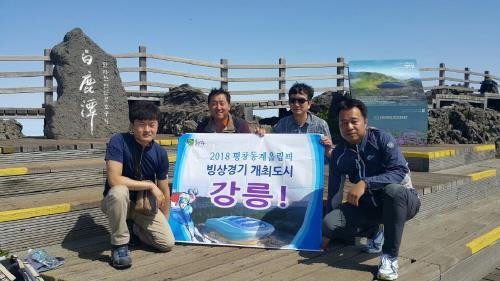 ▲ 강릉시 관계자들이 제주도 한라산 정상에서 2018평창동계올림픽 빙상경기 개최도시임을 알 리는 현수막을 펼치고 기념촬영하고 있다. <사진제공=강릉시청> |
