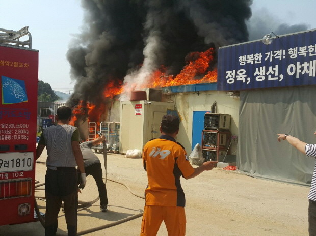 당시 할인마트에서 화재가 발생해 인근 고물상 민가 쪽으로 불이 옮겨 붙고 있는 상황이었다.