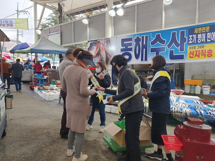 | ▲화순군이 복지 사각지대 발굴을 위해 캠페인을 펼쳐 군민의 관심과 참여를 촉구했다. 화순군 희망복지팀 관계자들이 화순읍 고인돌전통시장에서 군민에게 복지 사각지대 발굴 홍보 전단과 물품을 전달하며 캠페인을 펼치고 있다.(사진=화순군) |