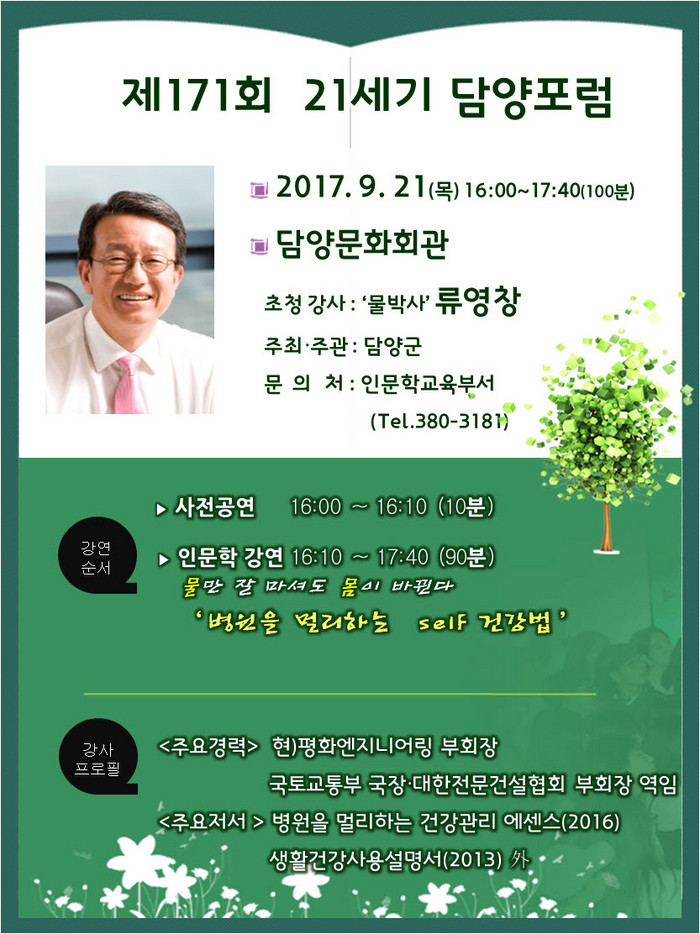 [세계로컬신문 강완수 기자] 전남 담양군은 오는 21일 오후 4시 담양문화회관 대공연장에서 평화엔지니어링 류영창 부회장을 초빙해 ‘병원을 멀리하는 Self 건강법’을 주제로 담양포럼을 연다고 15일 밝혔다.