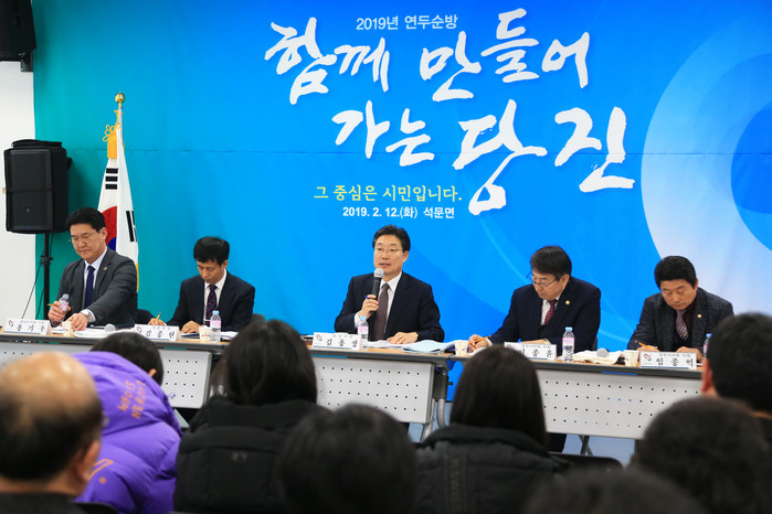 김홍장 당진시장은 12일 석문문화스포츠센터에서 진행된 석문면 연두순방을 통해 지속가능한 성장으로 더 큰 도약을 이끌어 내겠다는 올해 시정 운영방향을 밝혔다.