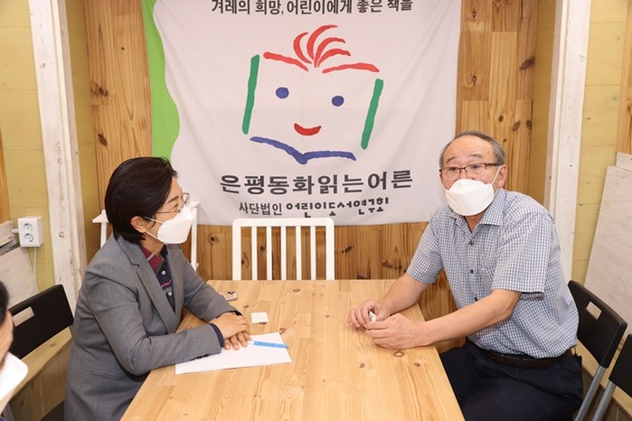 | ▲ 김미경 은평구청장이 31일 불광문고 직원과 얘기를 나누고 있다(사진=서울시 은평구) |