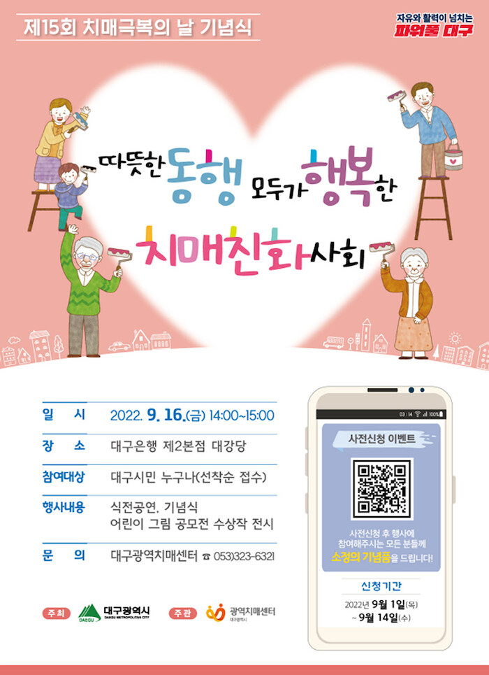 이번 치매극복의 날 기념식은 ‘따뜻한 동행 모두가 행복한 치매친화도시 대구’라는 주제 아래 9월 16일 대구은행 제2본점 대강당에서 열린다.
