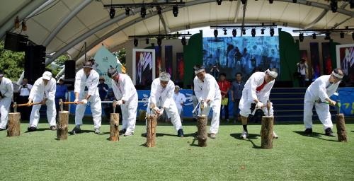 ▲ 전남 강진군이 이달 31일 청자축제장에서 제2회 전국 화목가마 장작패기 대회를 개최한다. 사진은 지난해 대회에서 참가자들이 장작을 만드는 모습.<사진제공=강진군청> |