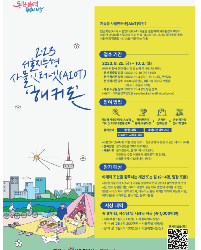 [세계로컬타임즈 이효진 기자] 서울시는 지능형 사물인터넷(AIoT) 기기와 데이터를 활용해 한강공원의 시민 불편사항을 해결하는 아이디어 모집을 위한 ‘2023년 서울 지능형 사물인터넷(AIoT) 해커톤 공모전’을 개최한다.