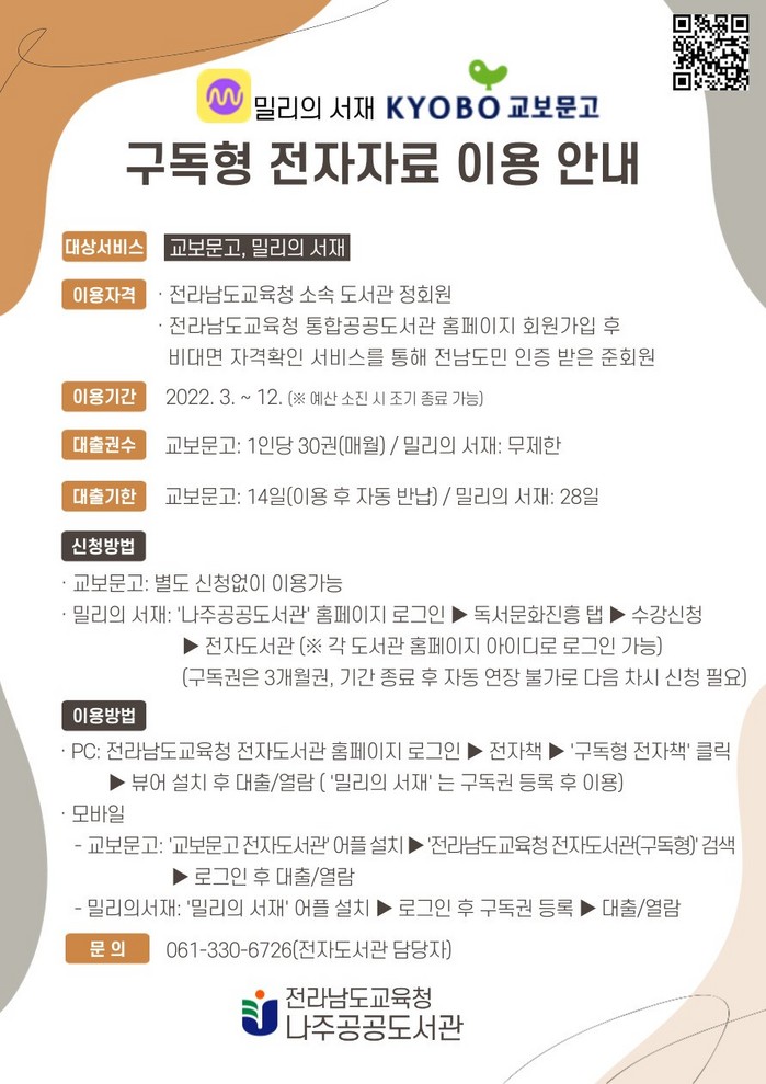 전남도민 누구나 통합공공도서관 회원가입을 통해 구독형 전자책 서비스인‘교보문고 전자도서관(구독형)’과 ‘밀리의 서재’를 이용할 수 있다.