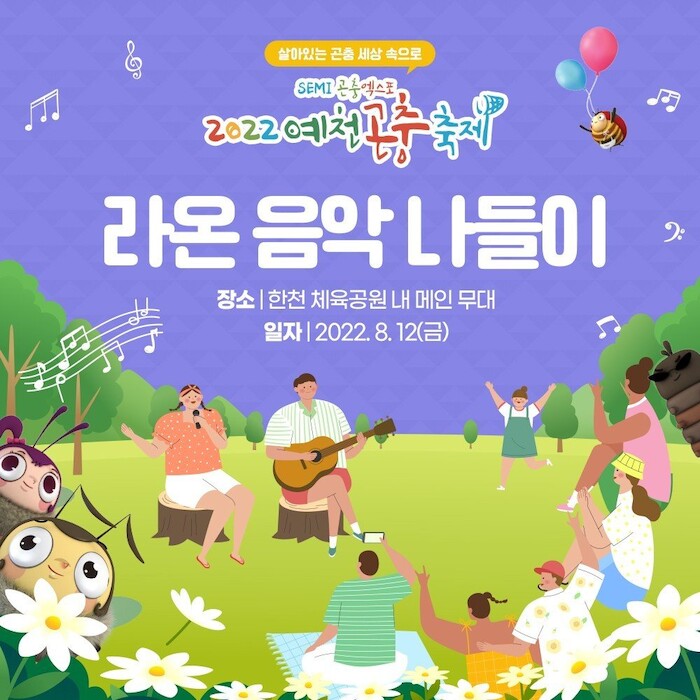 [세계로컬타임즈 이장학 기자] 예천군이 주최하고 라온문화사업단이 주관하는 라온의 음악나들이가 SEMI 곤충엑스포 2022 예천곤충축제 메인무대에서 12일 개최된다.