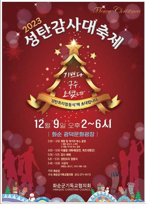9일 오후 2시부터 짧은 글짓기, 먹거리 부스를 운영하고 공연과 퀴즈문제풀이 행사에 이어 5시에 화순기독교협의회 주최로 축하 예배와 공연, 성탄 트리 점등식 이 진행된다.