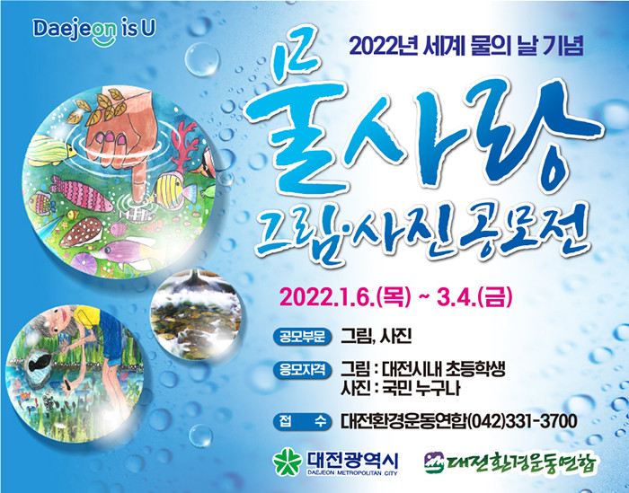 [세계로컬타임즈 민순혜 기자] 대전시와 대전환경운동연합은 오는 3월 22일 ‘세계 물의 날’을 앞두고 ‘지하수 : 보이지 않는 물을 보이게 하자’라는 주제로 오는 3월 4일까지 ‘2022 물사랑 그림·사진 공모전’을 개최한다고 6일 밝혔다.