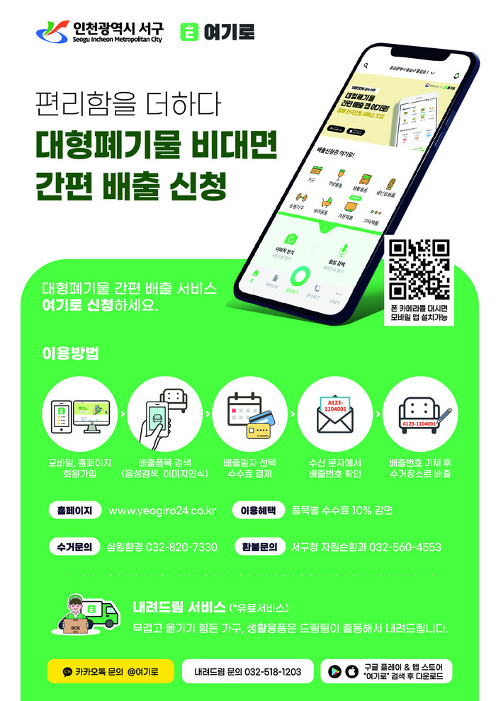 이번에 서구가 시행하는 대형폐기물 간편 배출시스템은 ㈜지금여기에서 운영하는 모바일 앱 ‘여기로’를 통해 운영되며 이 시스템은 행정안전부 주관 2020년 주민생활혁신확산사례 및 인천시 스마트시티 시범운영사업으로 선정되기도 했다.