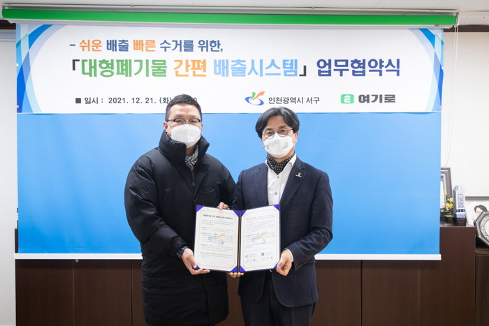 [세계로컬타임즈 한창세 기자] 인천 서구(구청장 이재현)가 21일 대형폐기물의 쉬운 배출과 빠른 수거를 위해 운영사 ㈜지금여기와 업무협약을 체결하고 ‘대형폐기물 간편 배출시스템’을 운영한다.