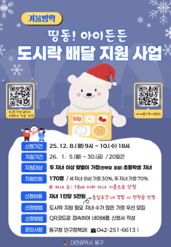 박희조 동구청장은 “지난 여름에 이어 이번 겨울방학에도 돌봄 서비스 이용이 어려운 맞벌이 가정에 실질적인 도움이 되길 바라며, 많은 관심과 참여를 부탁드린다”고 말했다.