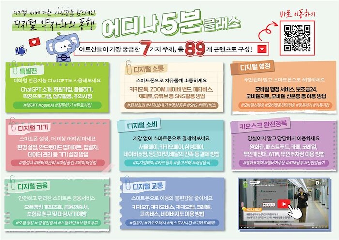올해 공개되는 ‘어디나 5분클래스’는 총 7개 주제로 ▲디지털 교통(6개) ▲디지털 기기(14개) ▲디지털 소통(9개) ▲ 키오스크(10개)▲ 디지털 소비(6개) ▲ 디지털 행정(5개) ▲ 디지털 금융(5개)▲ 챗GPT(2개) 분야의 57개 콘텐츠로 구성돼 있다.