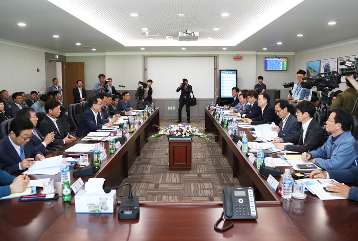 | ▲ 백운규 산업통상자원부장관이 23일 충남 당진화력발전소를 방문해 미세먼지 감축방안 등을 논의하고 있다. <사진제공=당진시> |