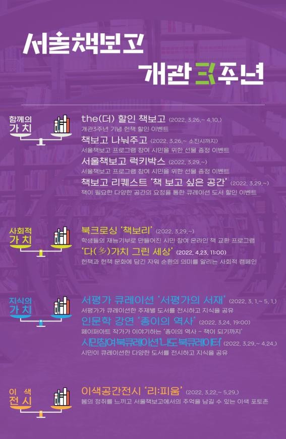 개관 3주년을 맞아 ‘서울책보고’를 사랑해 온 시민을 위해 26일부터 특별 프로그램 ‘다(多)가치 책보고’를 운영한다. 단순한 복합문화공간의 기능을 넘어 가치공유 플랫폼으로 역할을 확장 중인 ‘서울책보고’가 함께사는 세상을 위해 세 가지 가치(함께·사회적·지식 가치)를 담은 프로그램을 준비했다.