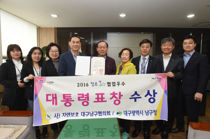 | ▲ 대구시 남구청과 자연보호대구남구협의회 관계자들이 음식물쓰레기 줄이기 '드림캐시백' 운동으로 대통령 표창을 수상한 후 기념촬영을 하고 있다. <사진제공=대구시 남구청> |
