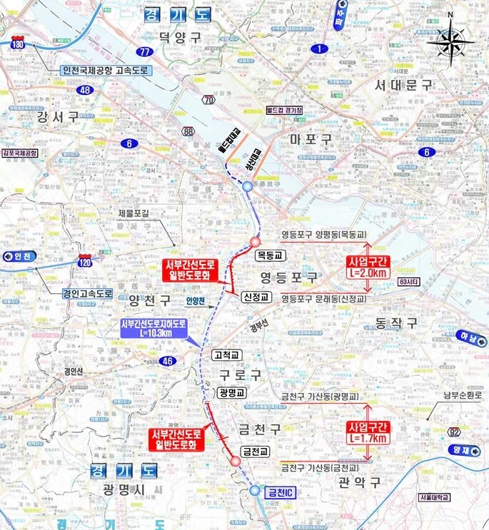 [세계로컬타임즈 이효진 기자] 서울시가 서부간선도로 내 영등포구 구간(목동교~신정교, 2km)과 금천구 구간(광명교~금천교, 1.7km)의 차로 폭을 줄이고, 도로변에 보도와 녹지를 조성한다.