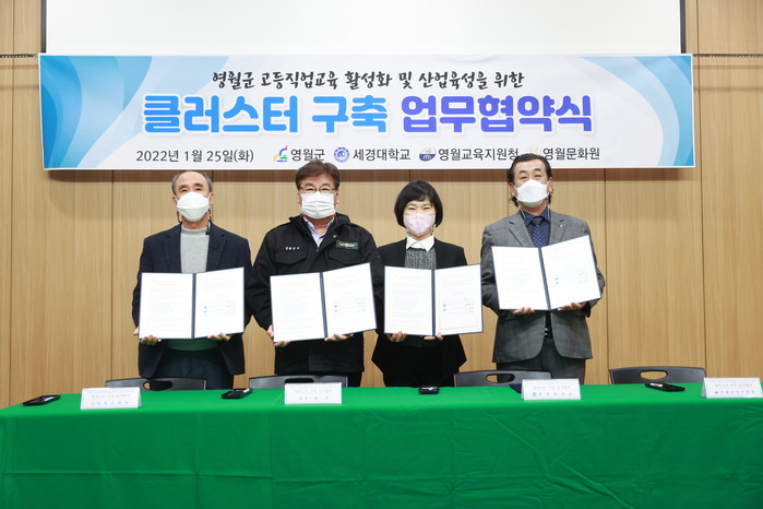 [세계로컬타임즈 김재민 기자] 영월군과 세경대학교, 영월 교육지원청, 영월문화원이 지역주민과 영월군 경쟁력 강화 방안의 일환으로 ‘영월군 평생직업교육 활성화와 산업 육성’ 클러스터 구축을 위한 업무협약식을 25일 세경대학교 학생성공센터에서 가졌다.