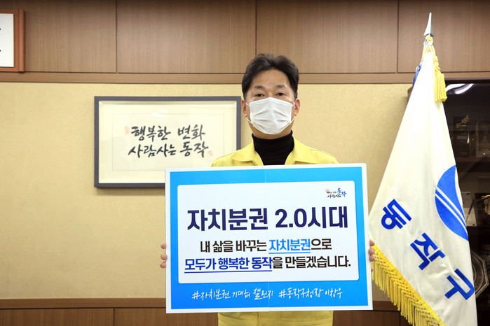 유성훈 금천구청장의 지목으로 동참한 이창우 동작구청장은 지난 12일 진행한 ‘자치분권 2.0시대, 내 삶을 바꾸는 자치분권으로 모두가 행복한 동작을 만들겠습니다’ 는 메시지를 전달하고 주민과 함께 하는 자치분권시대의 각오를 다졌다.