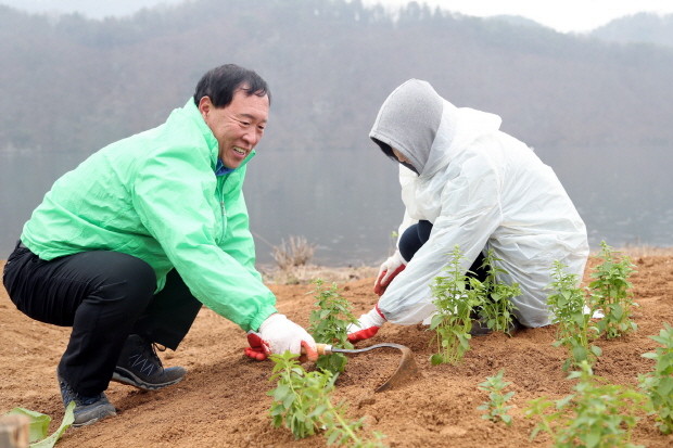 | ▲김성기 가평군수(왼쪽)가 5일 자라섬에서 식목일을 맞아 기념식수를 하고 있다.<사진제공=가평군청> |