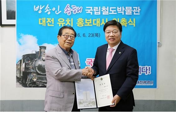 이에 권선택 시장은 "대전이 최적지인데 지자체간 공모가 진행되면서 너무 치열하게 경쟁하는 분위기"라며 "우리나라 대표 원로 연예인이 홍보대사로 위촉돼 든든하다. 대전이 철도박물관을 유치할 수 있도록 도와 달라"고 당부했다.