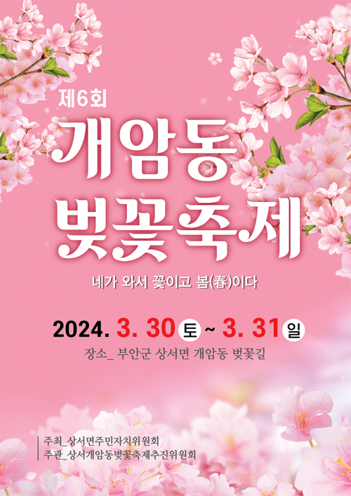 최기현 벚꽃축제추진위원장은 “사고없는 더 안전한 축제 개최와 다양한 볼거리를 위해 빈틈없이 최선을 다해 준비하고 있으니, 올봄 개암동 벚꽃길을 가족, 연인, 친구와 함께 꽃길 걸으며 행복하고 사랑스러운 시간을 맞이하기 바란다”고 전했다.