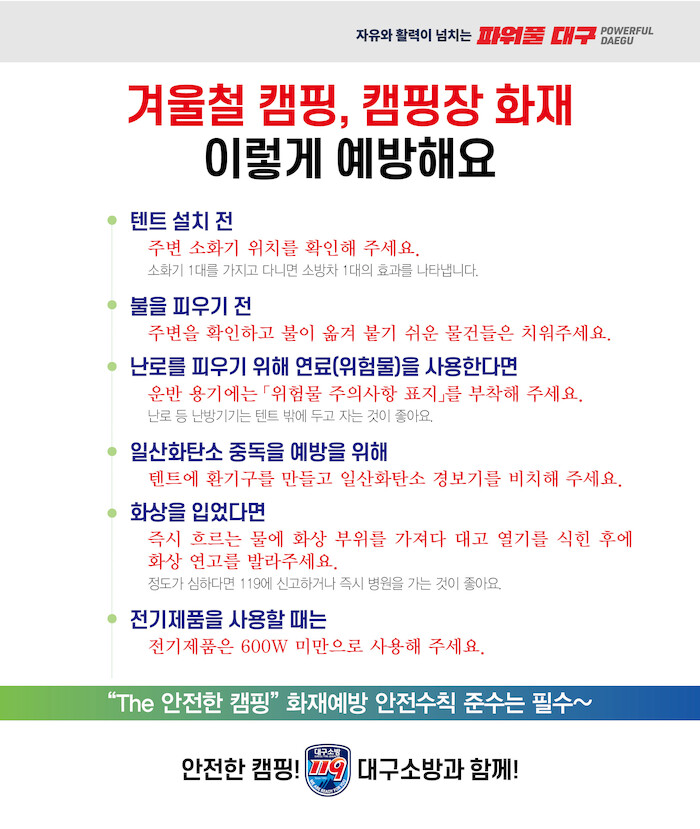 ▲ 대구소방 겨울철 캠핑장 화재예방 안내문(사진=대구시) |