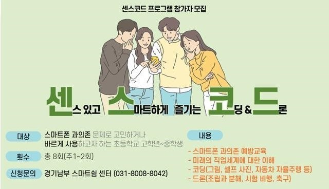 [세계로컬타임즈 이호 기자] 스마트폰 과의존 문제를 겪는 경기도내 청소년을 위해 코딩·드론 활용 프로그램인 ‘센·스·코·드’가 9월부터 12월까지 운영된다.