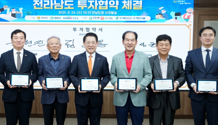 [세계로컬타임즈] 전라남도는 24일 도청 서재필실에서 ㈜성경식품, ㈜해진수산, ㈜해진식품 등 3개사와 투자금액 총 1천34억 원 규모의 투자협약을 했다고 밝혔다. 이번 투자로 302명의 신규 고용 창출도 기대된다.