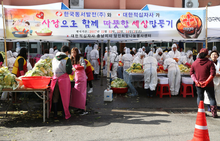 당진시에 따르면 대한적십자사 당진지구협의회(회장 김정곤) 회원 130여 명과 당진화력 임직원 50여 명은 지난 12일부터 14일까지 당진적십자봉사관에서 사랑의 김장 행사를 갖고 배추 2500여 포기의 김장 김치를 담갔다.