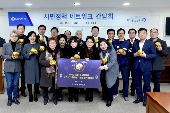 신년 떡국으로 오찬을 함께한 박남춘 인천시장은 2019년은 다복(多福)을 상징하는 황금돼지의 해 인 만큼, ‘인천시민이 더 풍요로운 한해가 되기를 바란다‘며 황금돼지 저금통을 전달하는 시간을 갖고, 저금통을 살찌워 금년 연말 취약계층에 전달하자는 깜짝 제안의 시간도 가졌다.