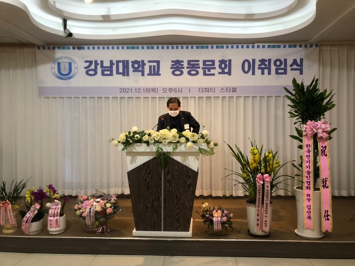 | ▲ 지난 16일 강남대학교 제27·28대 총동문회 회장 이·취임식 공학배 회장이 취임사를 하고 있다.(사진=강남대학교총동문회) |