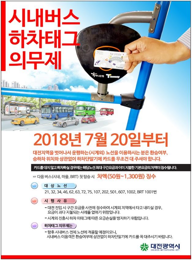 대전시는 7월 20일부터 대전지역을 벗어나서 운행하는 시내버스 노선에 대해 하차태그 의무제를 시행한다고 15일 밝혔다.