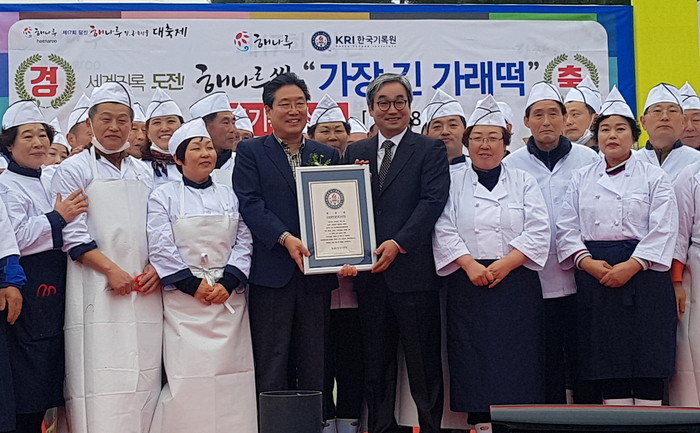 당진시에 따르면 11일 신평면 삽교호 관광지 일원에서 열린 행사에서 50명의 사람들이 이날 자정부터 해나루쌀 4.5톤으로 가래떡 만들기를 시작해 같은 날 오전 7시 15분 길이 5,080m, 지름 3㎝ 규모의 가래떡을 만들어 KRI한국기록원 공식 최장 4,430m 기록을 깨고 새로운 최장 기록으로 등록됐다.