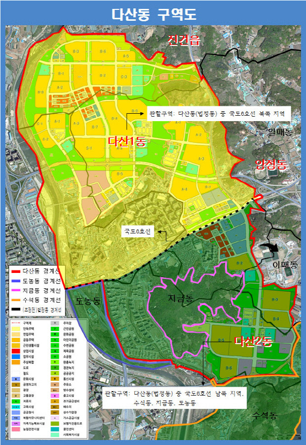 특히 행정동인 기존 도농동을 다산1동으로 명칭을 변경하고 국도6호선 기준 북쪽지역을 관할토록 했으며 기존 지금동을 다산2동으로 변경해 국도6호선 기준 남쪽 지역과 지금동, 가운동, 도농동, 수석동 등을 관할지역으로 조정했다.