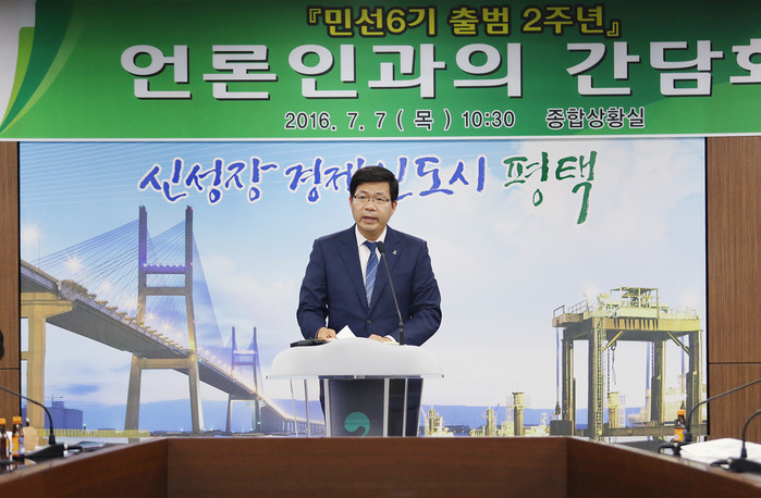 | ▲ 공재광 경기평택시장이 7일 종합상황실에서 언론인 70여명이 참석한 가운데 민선 6기 2년간의 성과와 향후 시정운영 방향에 대해 기자간담회를 진행하고 있다.<사진제공=평택시청> |
