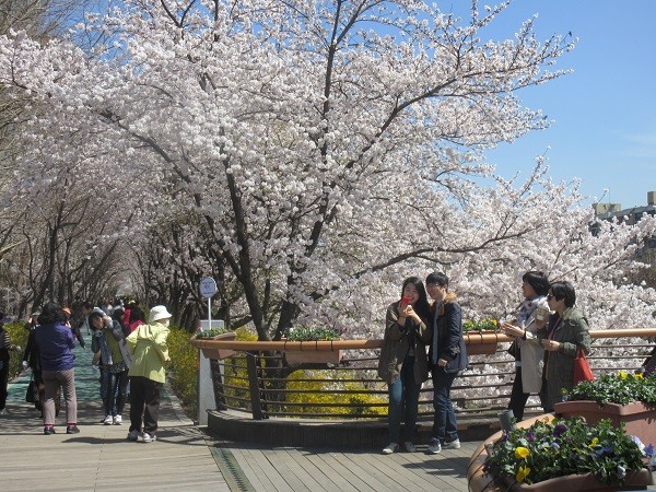| ▲ 지난해 양재천에 활짝 핀 벚꽃을 배경으로 시민들이 기념촬영하고 있는 모습.<사진제공=강남구청> |