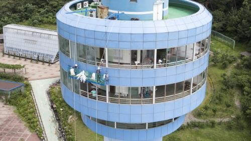 특히 시공상의 문제점으로 대두했던 원형 건물의 유리교체를 위해 곤돌라를 설치해 문제를 해결했다.