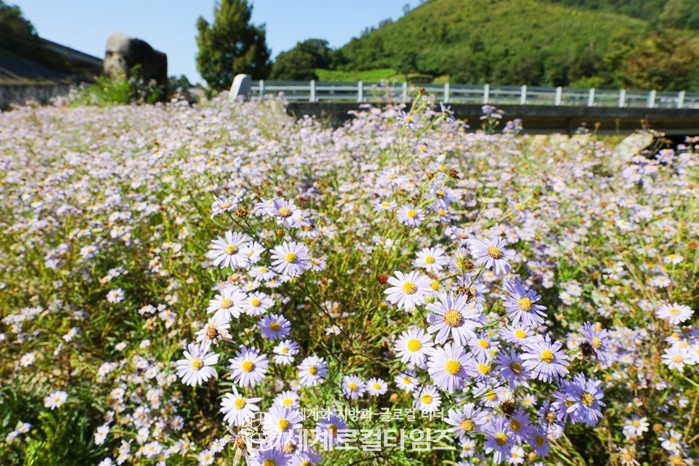 [세계로컬타임즈 김병호 기자] 녹색쉼표 단양군 적성면에 이른 봄부터 주민들이 흘린 구슬땀으로 피어난 단양쑥부쟁이가 만개해 장관을 이루고 있다.