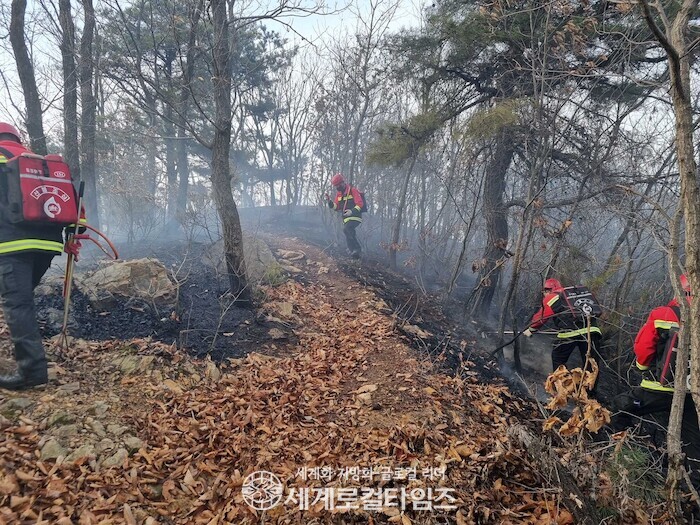 | ▲ 지난 3월 발생한 산불의 잔불을 산불진화대원들이 정리하고 있다. (사진=용인시) |