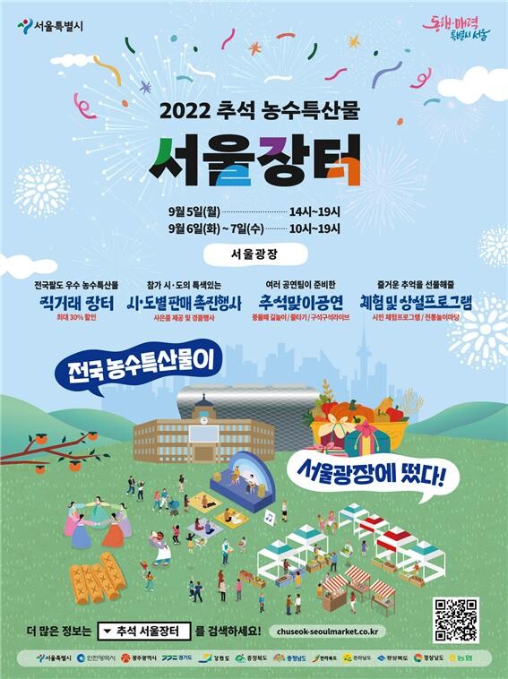 서울광장에서 3일간 진행되는 ‘추석 농수특산물 서울장터’에서는 전국 95개 시·군과 농협이 인증한 970여개 품목의 농수특산물을 한 자리에서 만날 수 있고, 각 지역 대표 특산물을 시중가격보다 10~30% 저렴하게 구입할 수 있다.
