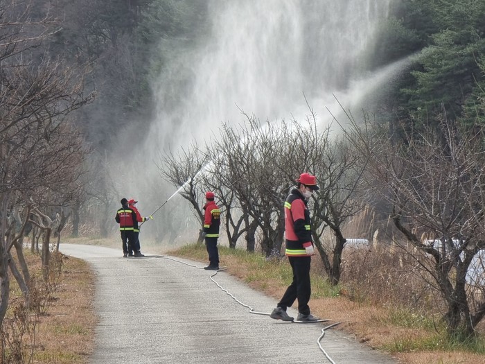 한편, 대형 산불 예방의 가장 중요한 요소인 초동진화체계를 구축하기 위해 매주 산불진화대 진화훈련 및 산불진화장비 점검은 물론, 산불취약지역 내 산불감시원 배치 및 순찰을 강화하고 있다.