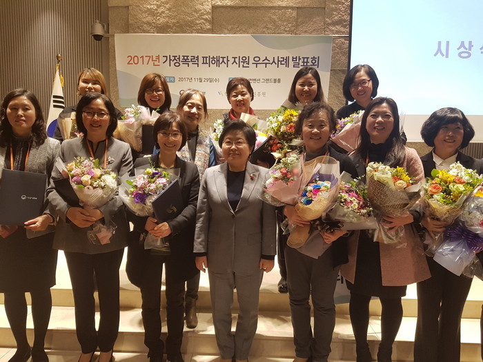 | ▲ 경남도가 지난 29일 여성가족부가 주최하고 여성긴급전화중앙지원단이 주관한 ‘2017 가정폭력 피해자 지원 우수사례 발표회’에서 ‘사천YWCA건강가정상담소’가 최우수상을 수상하고 기념촬영을 하고 있다. <사진제공=경남도청> |