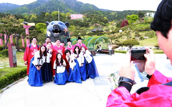 | ▲ 삼성전자 직원들이 산청 동의보감촌에서 어의와 의녀복을 입고 기념촬영하고 있다.<사진제공=산청군청> |