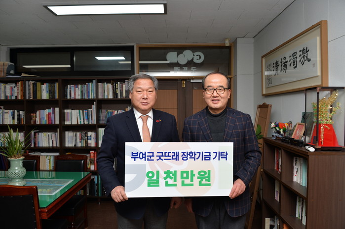 | ▲ 이용우 부여군수(왼쪽)가 지난 26일 임상빈 부여장례식장 대표로부터 굿뜨래 장학금 1000만원을 기탁받은 후 기념촬영하고 있다.<사진제공=부여군청> |