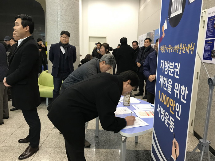 대한민국시도지사협의회와 전국시도의회의장협의회, 전국시장.군수.구청장협의회, 전국시군자치구의회의장협의 등 4개 단체가 지방분권 헌법 개정을 촉구하며 이달과 내달까지 천만 명 참여를 목표로 서명운동을 벌이고 있다.