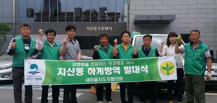 | ▲ 30일 경기도 평택시 지산동주민센터에서 새마을지도협의회원 10여명이 참석해 하절기 방역 발대식을 개최하고 기념촬영 하고 있다. |